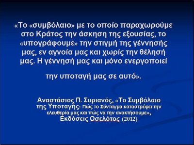 Πηγή: Αναστάσιος Π. Συριανός, «Το Συμβόλαιο της Υποταγής: πώς το Σύνταγμα καταστρέφει την ελευθερία μας και πώς να την ανακτήσουμε», Εκδόσεις Οσελότος (2012).