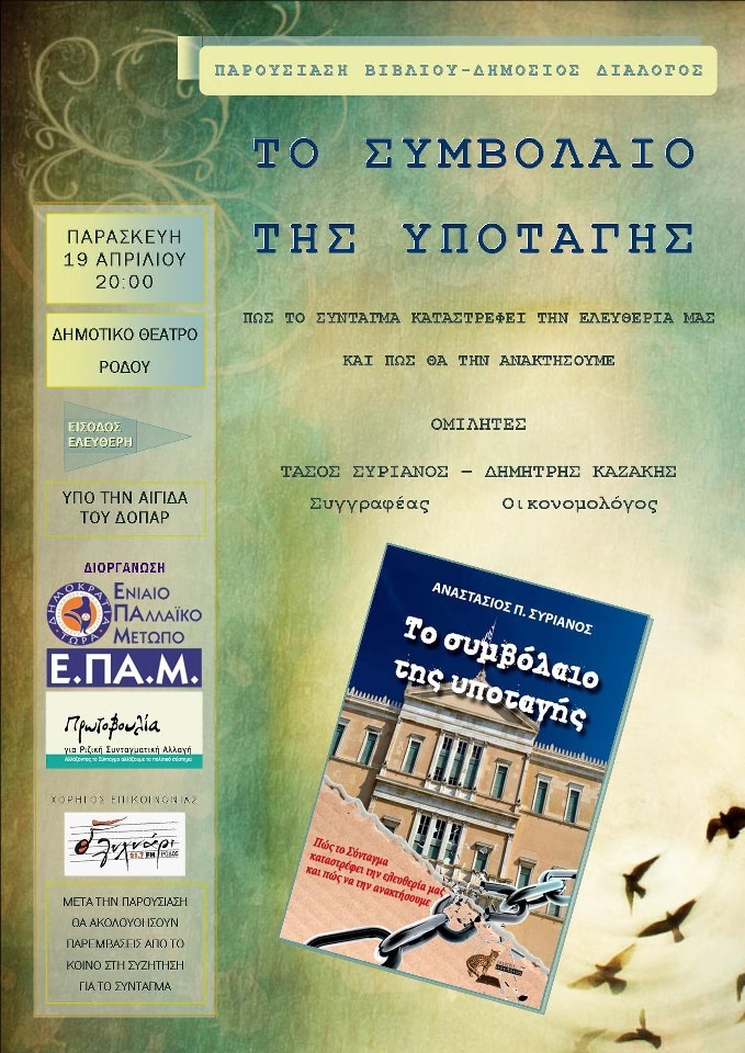Παρουσίαση του βιβλίου «Το Συμβολαιο της Υποταγης» στην Ρόδο Αναρτήθηκε από τον/τηνAnastasios Syrianos26 Μαρτίου 2013Δημοσιεύθηκε στηνΠαρουσιάσεις του βιβλίου Κοινοποίησε το: Μοιραστείτε στο X(Ανοίγει σε νέο παράθυρο) Χ Mοιραστείτε στο Facebook(Ανοίγει σε νέο παράθυρο) Facebook Μου αρέσει! Φόρτωση... Σχετικά