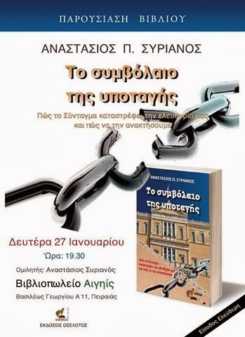Αυτην την Δευτέρα στον Πειραιά, στην νεα παρουσίαση του βιβλίου μου, θα δώσουμε έμφαση στην έννοια της κυριαρχίας και θα παρουσιαστούν ως παραδείγματα κατοχύρωσης της κυριαρχίας των πολιτών, ορισμενες προτεινόμενες συνταγματικές διατάξεις μεσα απο το «Συμβολαιο της Υποταγης». Θα ακολουθήσουν ερωτησεις και συζήτηση πάνω στα πολιτειακα ζητήματα της χώρας.