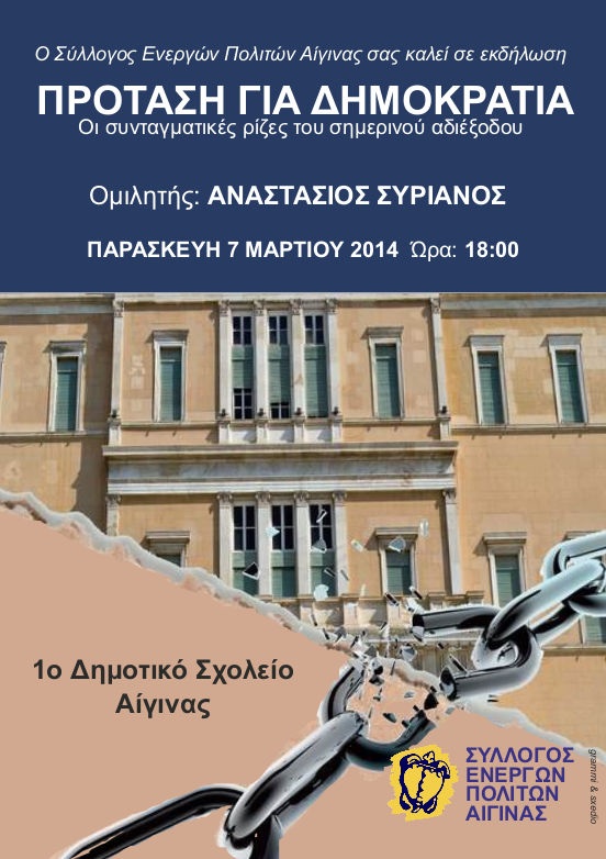 Στην Αίγινα θα βρεθω αύριο Παρασκευή 7 Μαρτίου προσκεκλημένος του Συλλόγου Ενεργών Πολιτων του νησιού, όπου θα πραγματοποιησω ομιλία με τίτλο «Πρόταση για Δημοκρατια· οι συνταγματικές ρίζες του σημερινού αδιεξόδου». Η ομιλία θα πραγματοποιηθεί στο 1ο Δημοτικό Σχολείο Αιγινας στις 18:00, με ανοιχτή συμμετοχή των πολιτών του νησιου, με τους οποίους ευελπιστώ να εχω και μια γόνιμη συζήτηση γύρω απο τα ζητήματα του Συντάγματος και της Δημοκρατίας.