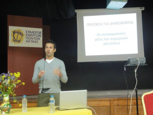 Κοινη ομιλια για το Συνταγμα και την Δημοκρατια πρόκειται να πραγματοποιήσουν σημερα Μ. Τριτη οι νεαροί συγγραφείς και επιστήμονες, Σταύρος Καλεντεριδης και Αναστάσιος Συριανος. Θα ακολουθήσει ανοιχτη και διαδραστικη συζήτηση με το κοινο.